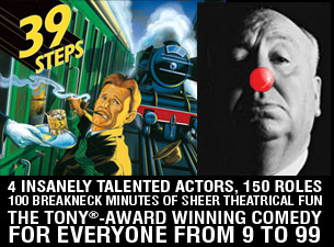 comedy that Ben Brantley of the New York Times calls "Absurdly Enjoyable." It's a CRITIC'S PICK from both Time Out NY and 39 Steps is a comedic spoof of the classic 1935 film, with only 4 'insanely talented' actors portraying more than 150 characters, sometimes changing roles in the blink of an eye. The brilliantly madcap story follows our dashing hero Richard Hannay as he races to solve the mystery of The 39 Steps, all the while trying to clear his name! The show’s uproarious fast-paced 100 minutes promises to leave you gasping for breath… in a good way! For more infomation, visit www.39stepsny.com |