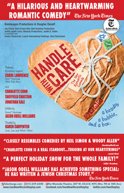Handle With Care The Play by Jason Odell Williams played its 112th and final performance of this run at the Westside Theatre to a sold-out house! 12,000 people laughed and loved this hit romantic comedy during this run, and the play is being licensed worldwide by Dramatists Play Service, so thousands, if not millions more people will share in the joy! Visit our website www.handlewithcaretheplay.com for ongoing updates on upcoming regional productions around the WORLD! HANDLE WITH CARE, is a "Critics' Pick" from the New York Times which calls it "a hilarious and heartwarming romantic comedy" that 'exudes gobs of comic energy and insight!" and also says "Jason Odell Williams has achieved something special..." The play, by Emmy Award nominee Jason Odell Williams was directed by Karen Carpenter ("Love, Loss and What I Wore") Is their inevitable love an accident?