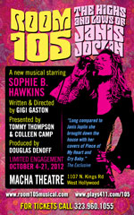 "ROOM 105, The Highs and Lows of Janis Joplin" is a new one-woman musical starring Grammy-nominated Sophie B. Hawkins, written and directed by Gigi Gaston. "ROOM 105" is a thoughtful and entertaining tribute to legendary soul singer Janis Joplin. The show is a humorous, engaging, bittersweet, and honest confessional; Janis brings the audience into her world and her life, and teases viewers about aspects of modern day pop culture, of which she is privy. A modern-day retrospective on Joplin’s turbulent life, telling a story that reveals the iconic singer’s thoughts on love, sex, fame and belonging. The show premiered on October 4, the very night of the anniversary of Janis Joplin’s death, at the MACHA Theatre in West Hollywood, CA. Its run was extended three times and ended December 22, 2012.